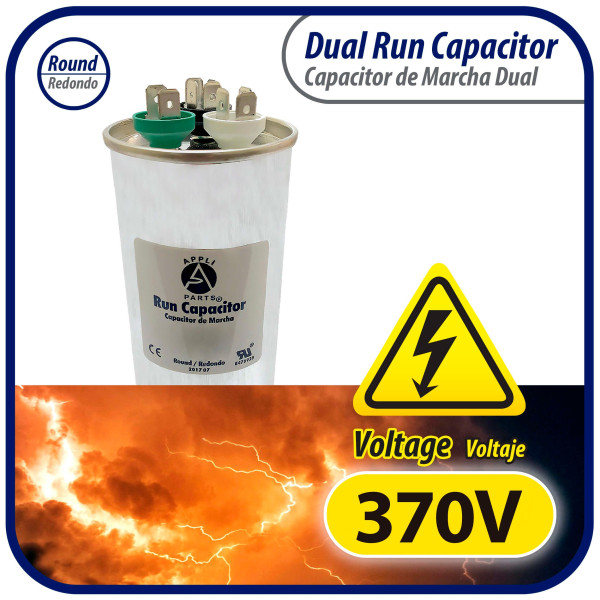 Appli Parts Dual Run Capacitor for ac 80+5 Mfd uF (microfarads) 370VAC CBB65 Round Universal fit for hvac and other applications 2-1/2 in Wide 5-1/4 in Height CON-80/5-370-R
