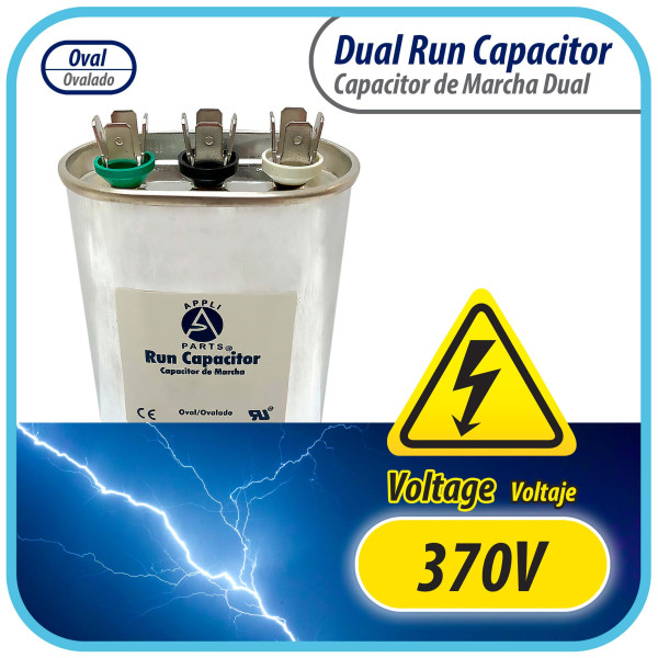 Appli Parts Dual Run Capacitor for ac 45+5 Mfd uF (microfarads) 370VAC CBB65 Oval Universal fit for hvac and other applications 2-3/4in Wide 1-3/4in Depth 4-3/4in High CON-45/5-370