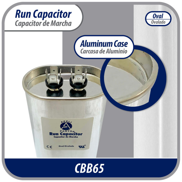 Appli Parts Run Capacitor for ac 45 Mfd uF (microfarads) 370VAC CBB65 Oval Universal fit for hvac and other applications 2-3/4in Wide 1-3/4in Depth 3-1/2in High CON-45-370