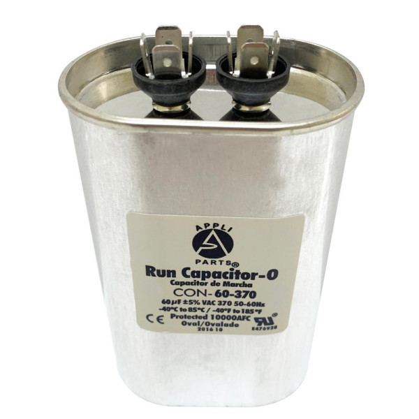 Appli Parts Run Capacitor for ac 60 Mfd uF (microfarads) 370VAC CBB65 Oval Universal fit for hvac and other applications 2-3/4in Wide 1-3/4in Depth 4-1/2in High CON-60-370