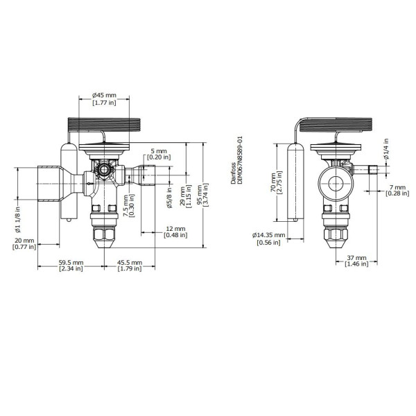 Danfoss 067N6178 7.5TR Thermostatic expansion valve, TGE, R404A,R507A, 5/8x1-1/8 in Solder, ODF, 1/4 in Externally equalized, Bi-flow, -40 to 50 F