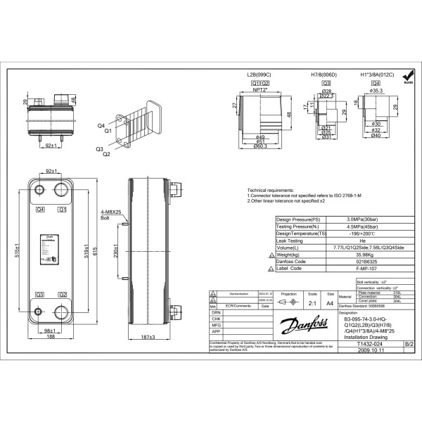 Danfoss 021B6325 Heat Exchanger 25 Ton B3-095-74-3.0-HQ 25TR