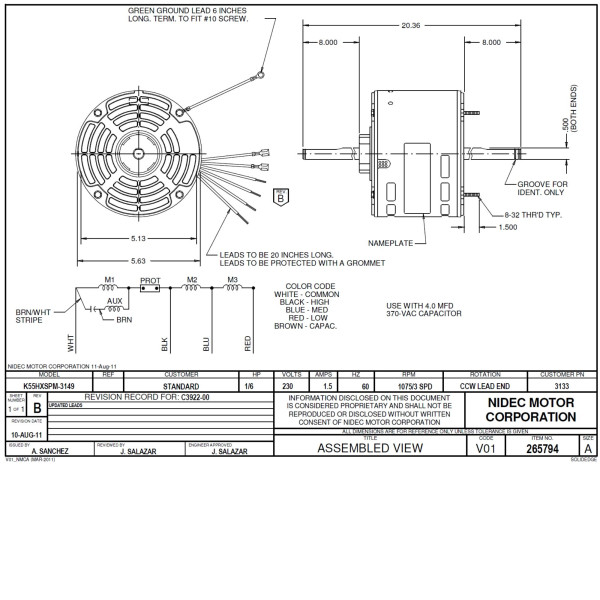 US Motors 1/6 hp 1075 rpm, 6 poles, 2 shaft, ODP Enclosure, 3 speed, 5.6 diameter, CCW, Lead End 230v, 60 hz, 1 ph, 4 mfd/370 VAC Run Capacitor 3133 K055SPM3149801N Replaced by 3134