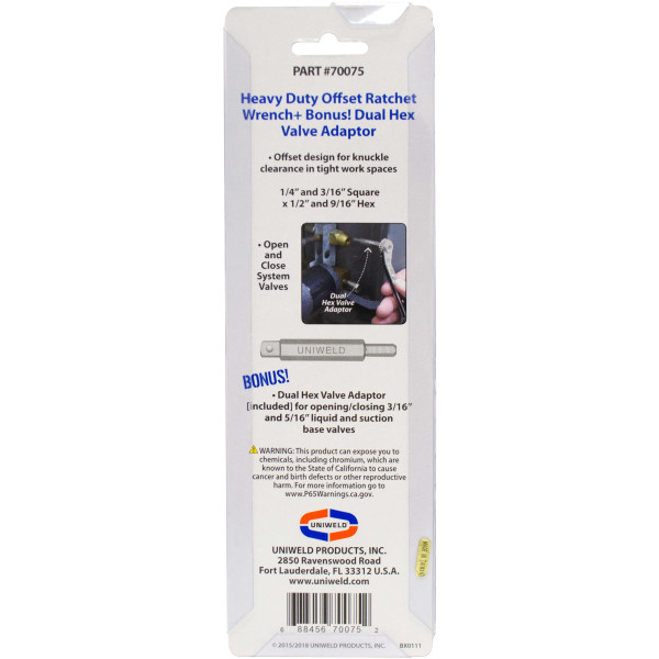 Uniweld 70075 Heavy Duty Offset Ratchet Wrench, 1/2 and 9/16 in Hex opening, 3/16 and 1/4 in Square opening, with 3/16 and 5/16 in Dual Hex Valve Adapter