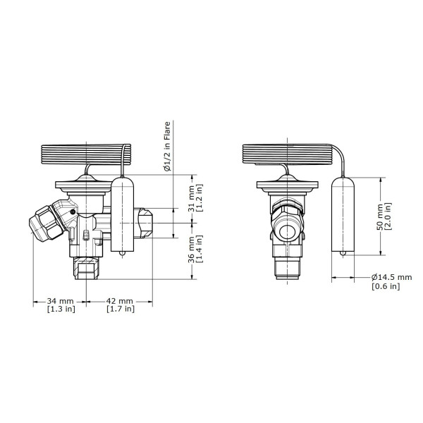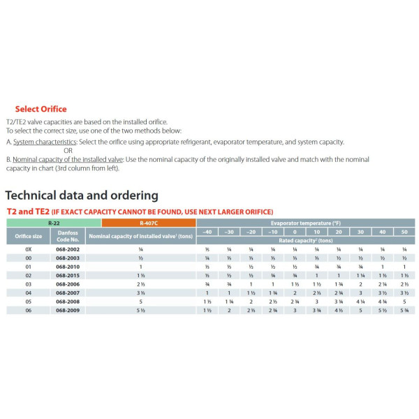 Danfoss 068Z3206 1/4 - 5.5TR Cuerpo de Valvula de Expansion, T 2, R22,R407C, 3/8x1/2 pulg, Flare Roscable, Ecualizacion Interna, Single-flow, -40 a 10 C, Capacidad determinada Segun Orficio, Producto Identico 0608Z3466